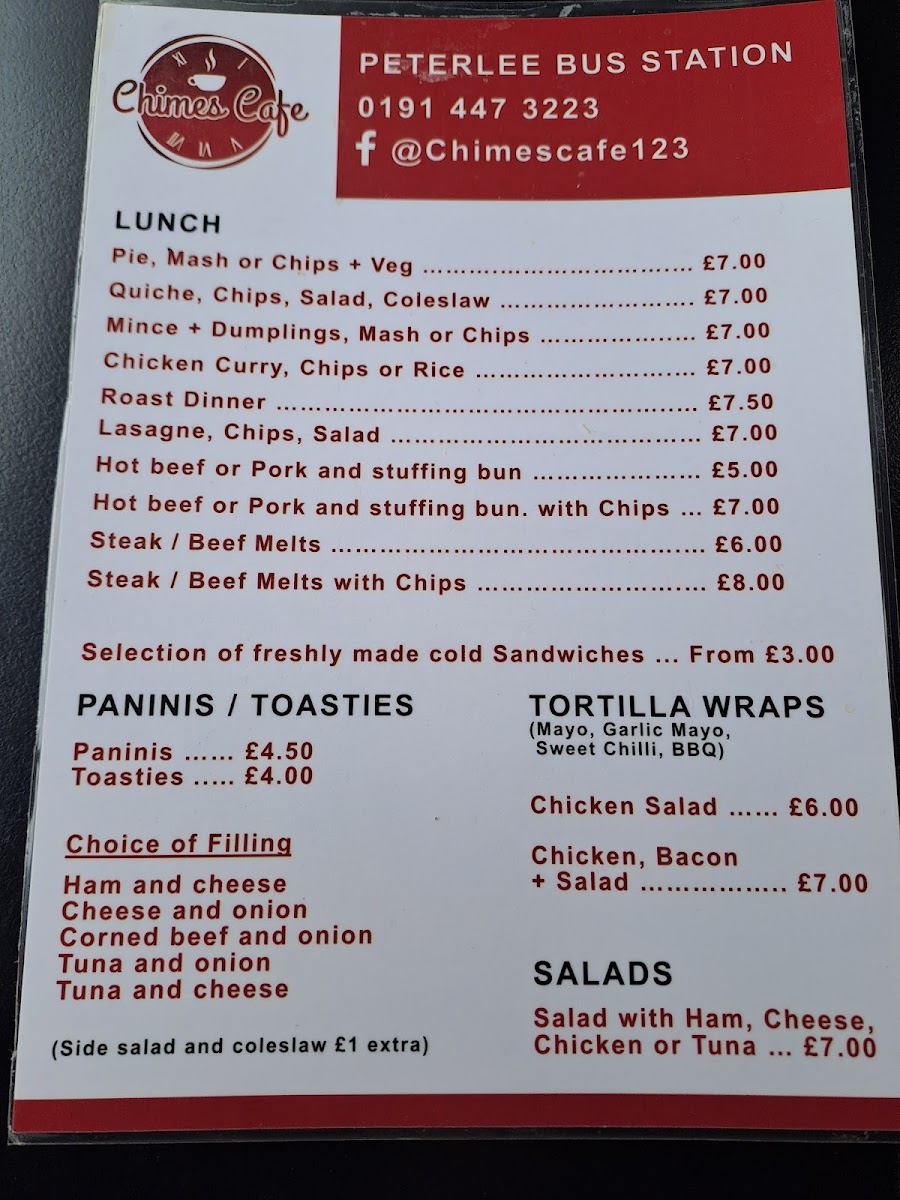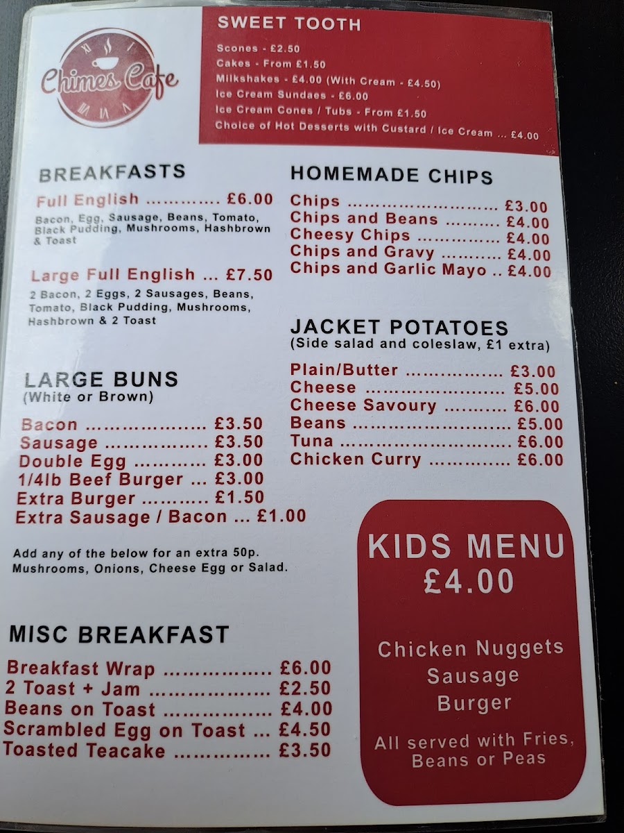 Additional menu highlights include traditional items like mince and dumplings, beef butty and chips, and a full English breakfast, alongside popular café beverages such as cappuccino.
